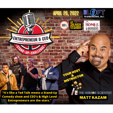 The Entrepreneur & CEO Stand-Up Challenge is a celebration of the spirit, passion and resilience of the entrepreneur. Bringing our community together and inspiring each other through laughter. Las Vegas Headliner & Humor Scientist Matt Kazam coaches 7 high-level entrepreneurs and CEO’s and puts them through a 6-week intensive growth experience where each will learn how to write & perform Stand-Up Comedy. Then we bring the experience live as each will perform on some of the biggest comedy stages. From there we let the engagement, impact & magic happen.